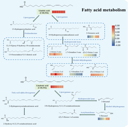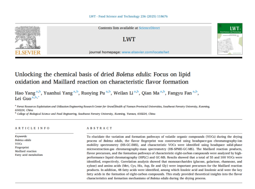 2025年11月,yl1111永利集团(食用菌现代产业公司)郭磊博士课题组在SCI I区top期刊《LWT - Food Science and Technology》上发表了一篇题为 “Unlocking the chemical basis of dried Boletus edulis: Focus on lipid oxidation and Maillard reaction on characteristic flavor formation” 的文章,探究了美味牛肝菌在采后干燥阶段中挥发性风味物质的动态变化及挥发性有机物、氨基酸和单糖之间的相关性。通过美味牛肝菌中的脂肪酸代谢物及其与关键挥发性有机物的相关性,初步研究了脂肪酸的代谢途径。这些发现为美味牛肝菌采后干制过程中风味形成机制提供了重要的理论见解,也为食用菌加工中的风味质量控制提供了参考。