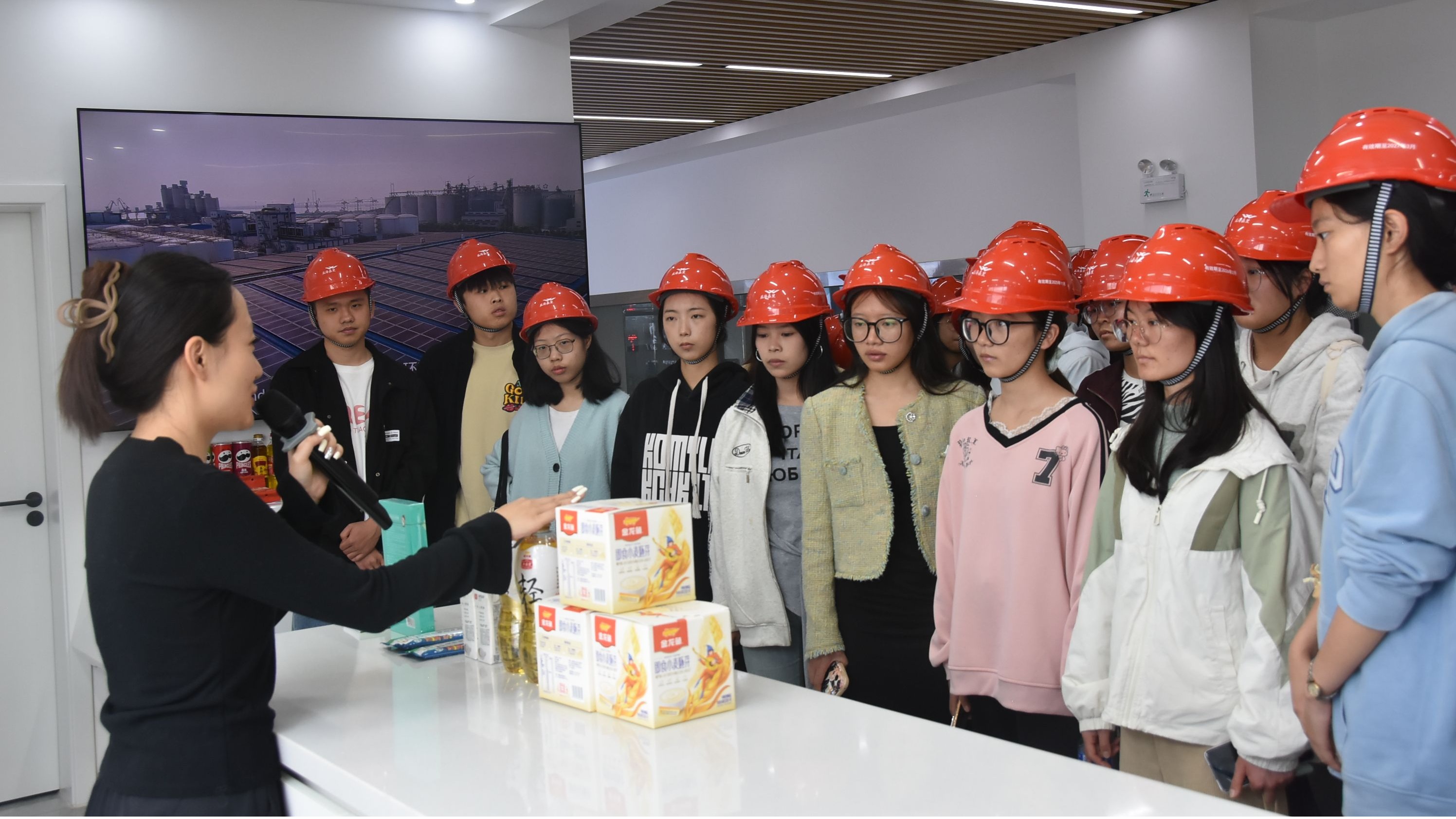 在公司工作人员的带领下,师生们参观了企业的文化长廊和小包装油生产线。公司管理人员详细介绍了益海嘉里集团的发展历程、产业布局以及在粮油食品行业的发展情况。通过实地观摩,大家更加直观地了解了企业在供应链管理和物流运输效率方面的情况。